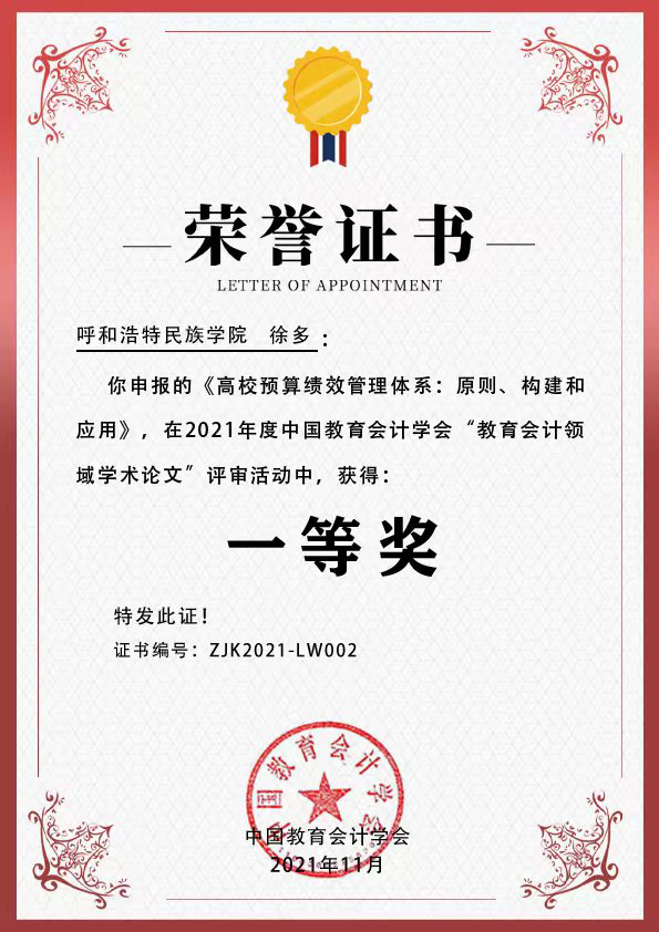 由中国教育会计学会举行的2021年“教育会计领域学术论文”征文运动评选效果日前揭晓,,,,,,我校财务处后勤财务治理科科长徐多的论文《高校预算绩效治理系统:原则、构建和应用》荣获一等奖。。。。。。。