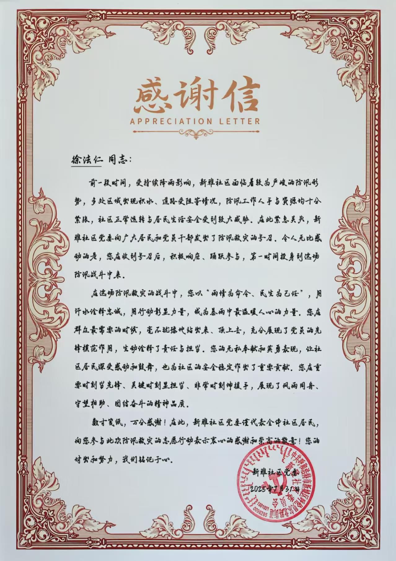 7月25日、26日,,,,,,受强降雨影响,,,,,,呼和浩特市区多处区域泛起积水、蹊径受阻等情形,,,,,,部分社区住民生涯清静受到较大威胁。。。。。。汛情就是下令,,,,,,徐法仁同志第一时间响应社区紧迫招募自愿者通知,,,,,,冒着仍未阻止的大雨迅速赶到现场,,,,,,投身外地防汛事情,,,,,,为社区防洪抗灾和清静稳固做出了突出孝顺,,,,,,展现出一名党员干部高度的社会责任感和无私的贡献精神。。。。。。