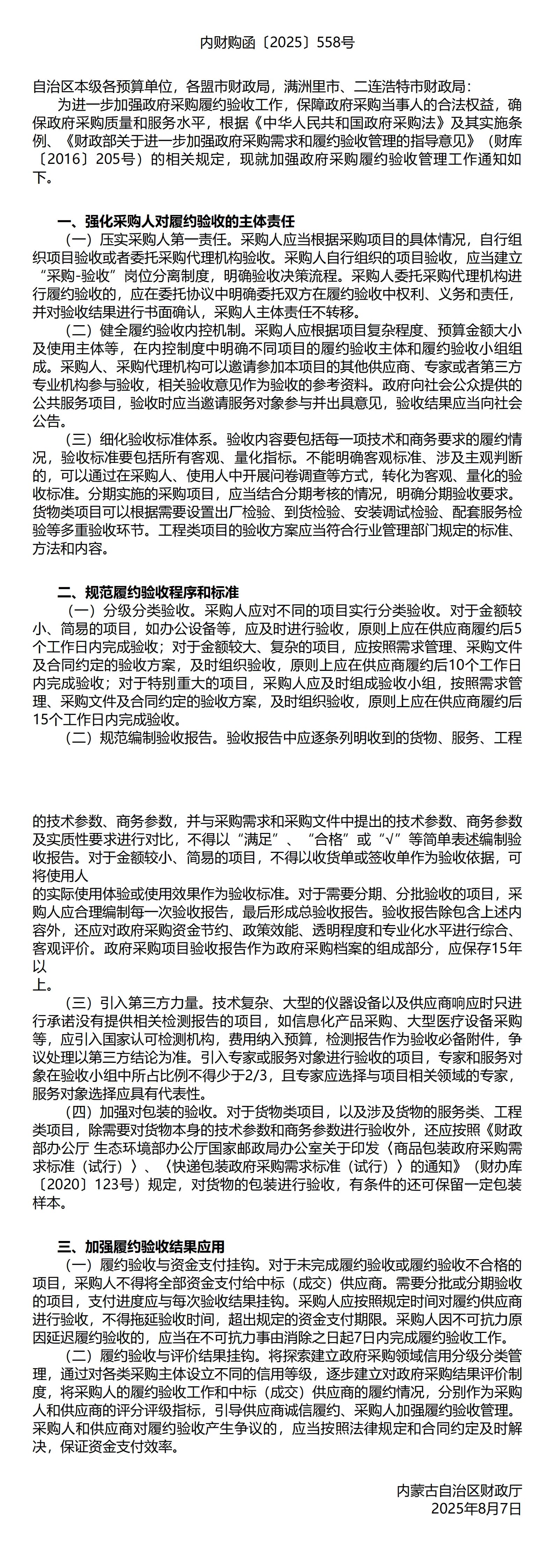 内蒙古自治区财务厅关于增强政府采购履约验收事情的通知