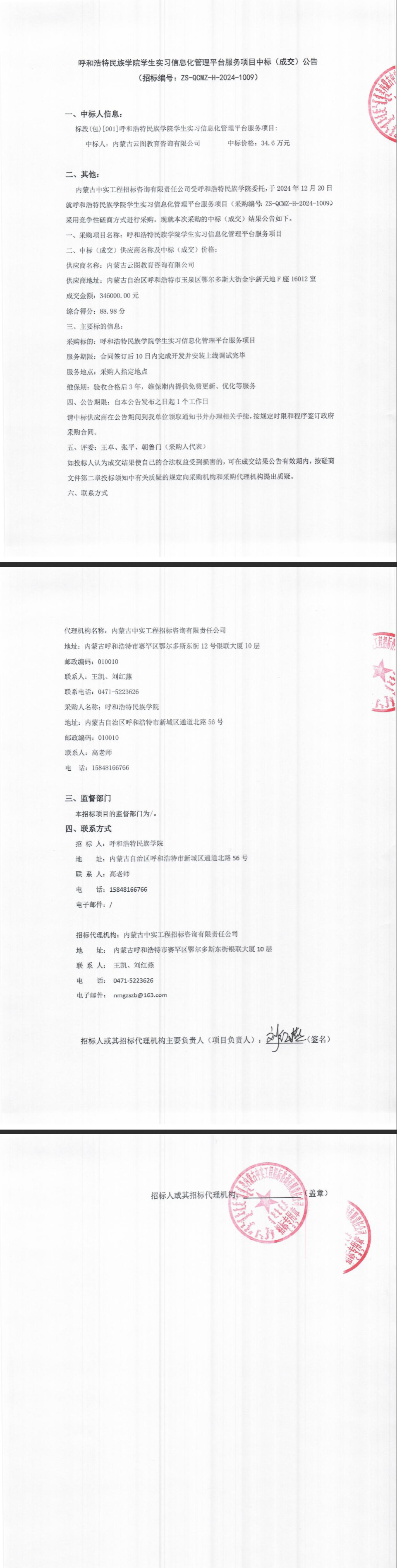胜天国际官网学生实习信息化治理平台效劳项目中标(成交)通告