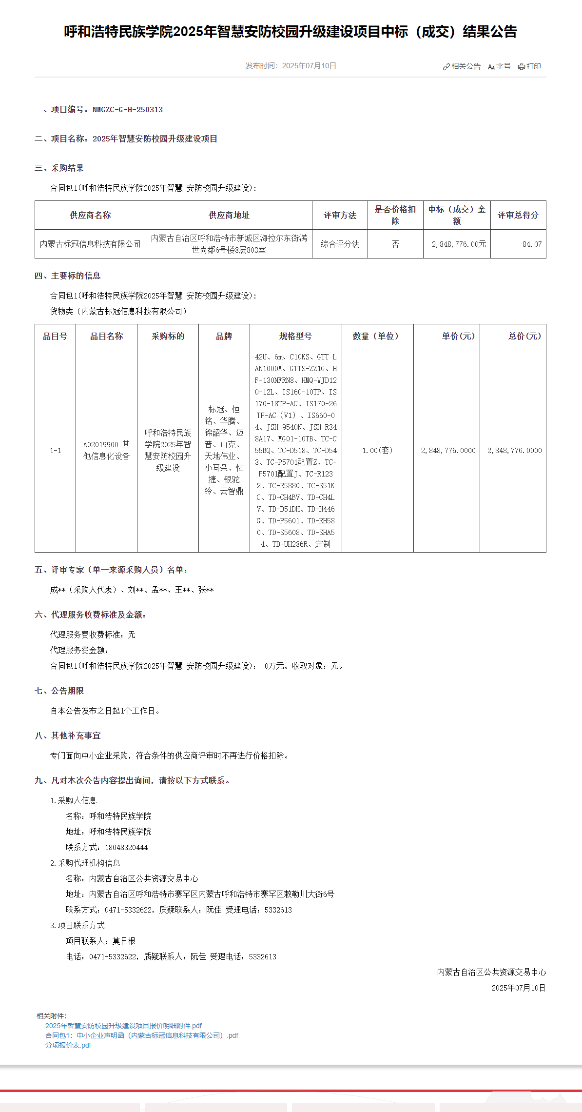 胜天国际官网2025年智慧安防校园升级建设项目中标(成交)效果通告