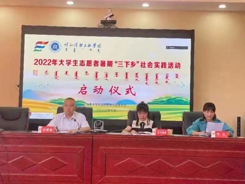仪式上,,,,,,,,团委书记苏伦高娃、副书记白银亮向暑期“三下乡”社会实践团队授旗,,,,,,,,标记着我校2022年暑期“三下乡”社会实践运动正式启动。。。。。。。