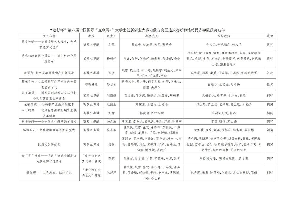 第八届中国国际“互联网+”大学生立异创业大赛内蒙古赛区选拔赛总决赛于8月11日下昼圆满落幕。。。。。8月15日自治区教育厅宣布《关于“建行杯”第八届中国国际“互联网+”大学生立异创业大赛区选拔赛评审效果的公示》,,,, ,,,,我校唬唬;;;;竦酶呓讨魅3银6铜、职教赛道1银、青年红色筑梦之旅赛道2铜以及青年红色筑梦之旅赛道优异组织奖。。。。。在奖牌总数上创我校在该赛事上的历史最好效果。。。。。