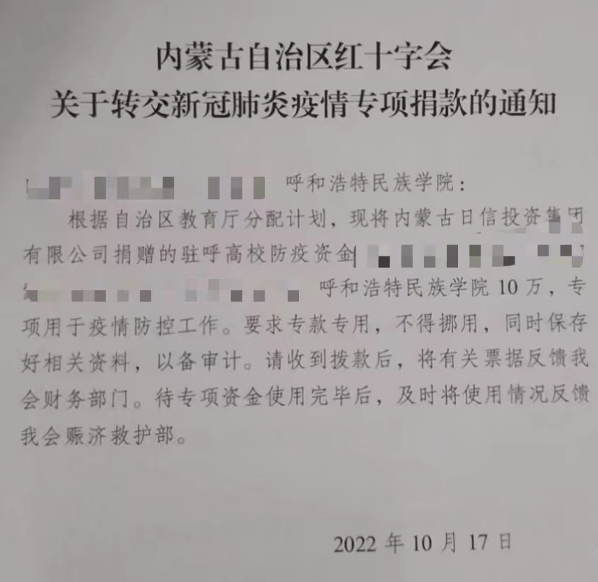 10月17日,,,,,,,,内蒙古日信投资集团有限公司通过内蒙古自治区红十字会,,,,,,,,为我校捐钱人民币10万元,,,,,,,,用于疫情防控事情,,,,,,,,助力我校打赢疫情防控攻坚战。。。。。。。。