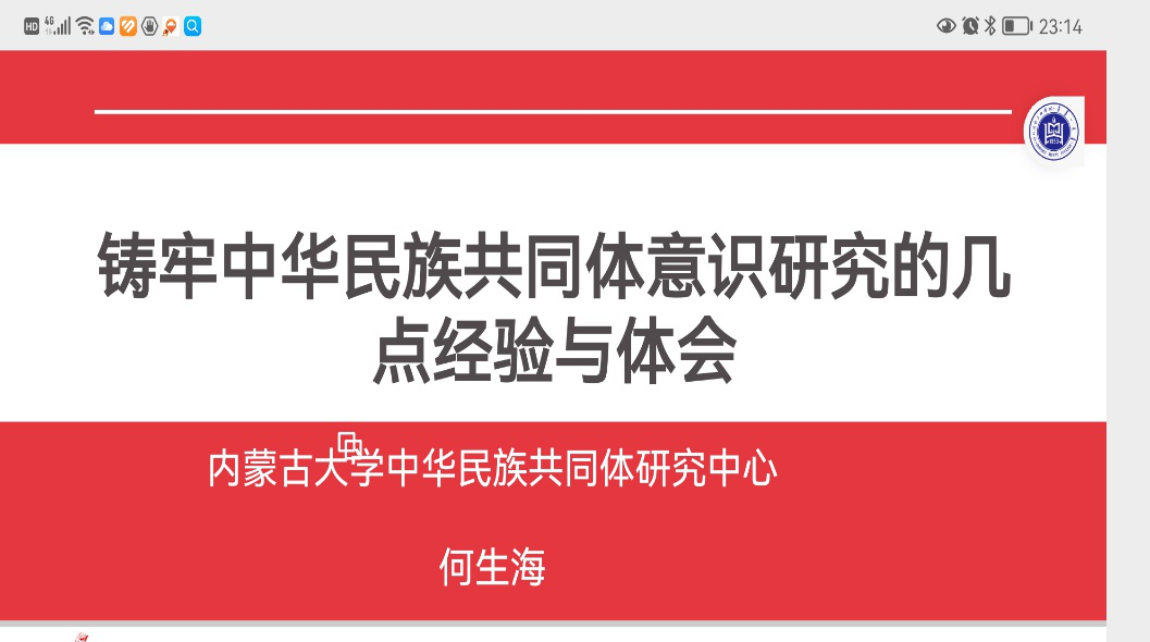应我校铸牢中华胜天国际官网配合体意识研究基地、胜天国际官网学学院配合约请,,,,,内蒙古大学铸牢中华胜天国际官网配合体意识研究培育基地首席专家、内蒙古自治区党委决议咨询专家、内蒙古自治区政协智库专家组成员、内蒙古大学三级教授、博士生导师何生海于12月8日晚7:00-9:00以在线形式为我校师生做问题为“铸牢中华胜天国际官网配合体意识研究的几点履历与体会”的学术讲座。。。。。