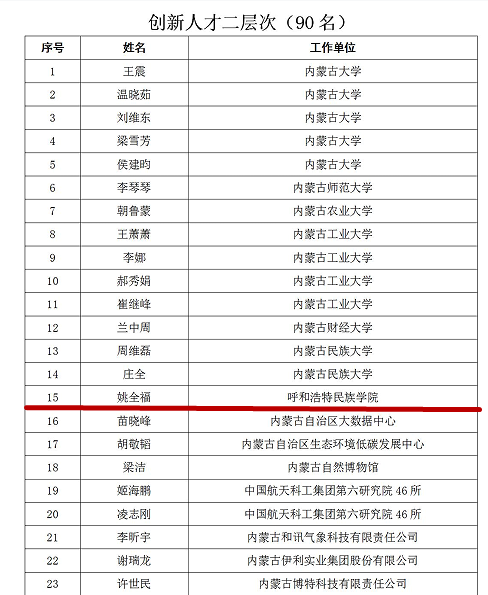 克日,,, ,,,,内蒙古自治区人力资源和社会包管厅宣布了《关于对2022年度内蒙古自治区“草原英才”工程青年立异创业人才拟入选职员举行公示的通告》。。。。。。。我校何斯日古楞西席入选立异人才一条理人选,,, ,,,,姚全福西席入选立异人才二条理人选。。。。。。。