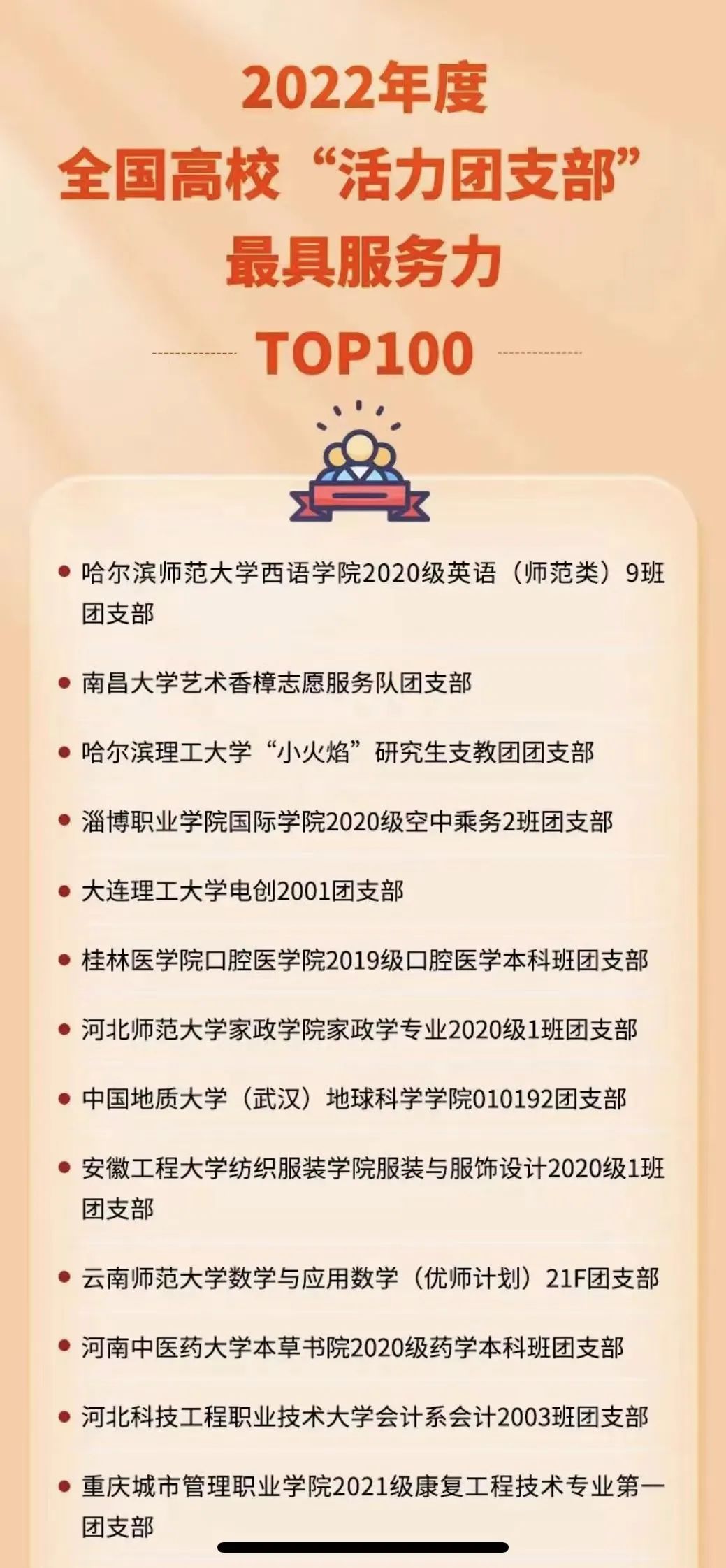 据悉,,,,,,,,2022年度天下高校“活力团支部”风范展示运动由团中央下层建设部指导、中国青年报社开展,,,,,,,,在引领力、组织力、效劳力、孝顺度、刷新味、好作风6个方面,,,,,,,,通过新媒体方法集中展现高校团支部刷新建设效果和典范履历,,,,,,,,深入贯彻“全团抓头脑政治引领”“全团大抓下层”“全团抓学校”事情安排,,,,,,,,提高高校团支部影响力。。。。。经由校内选树、校级展示、省级展示、天下展示等环节,,,,,,,,形成TOP100榜单。。。。。