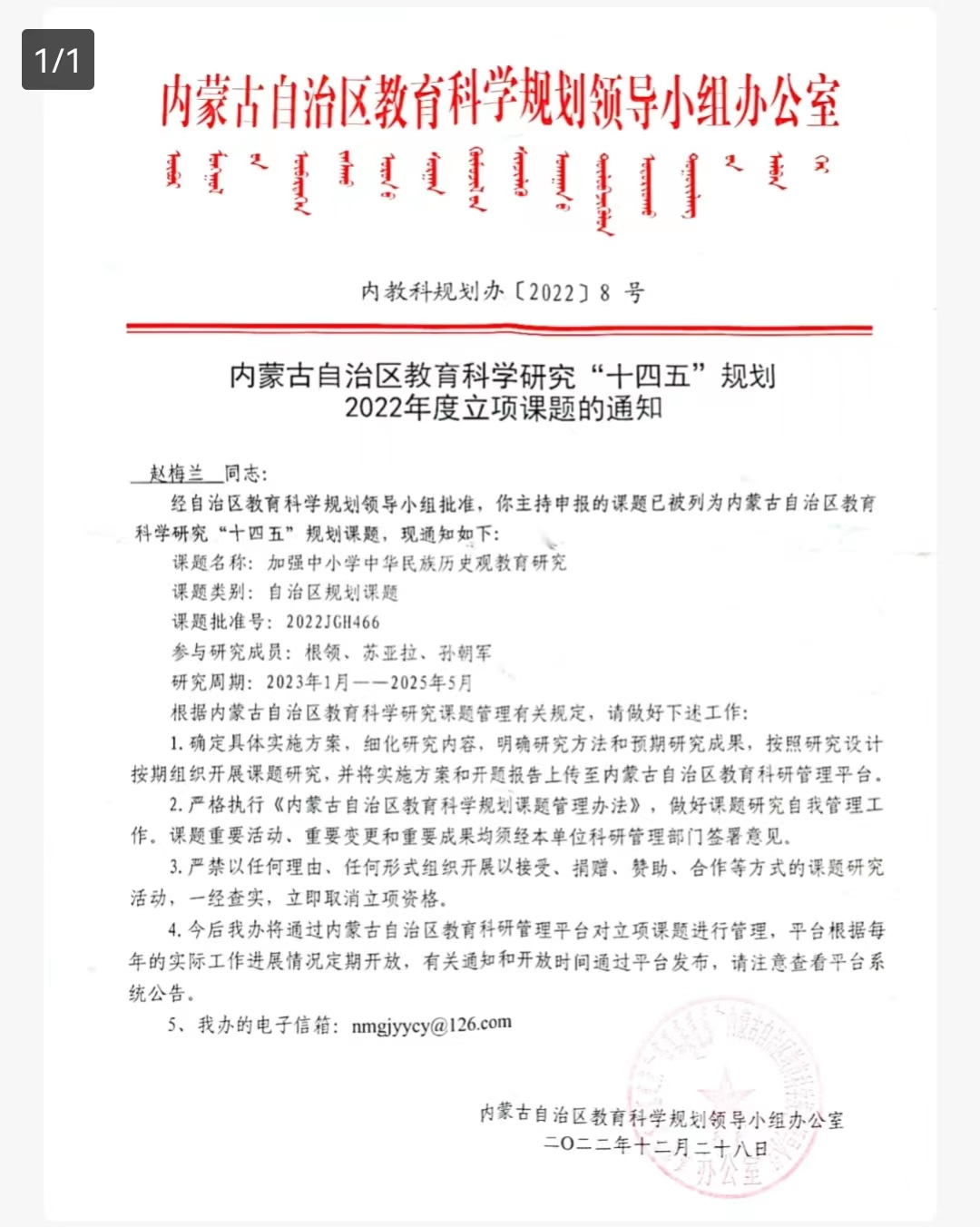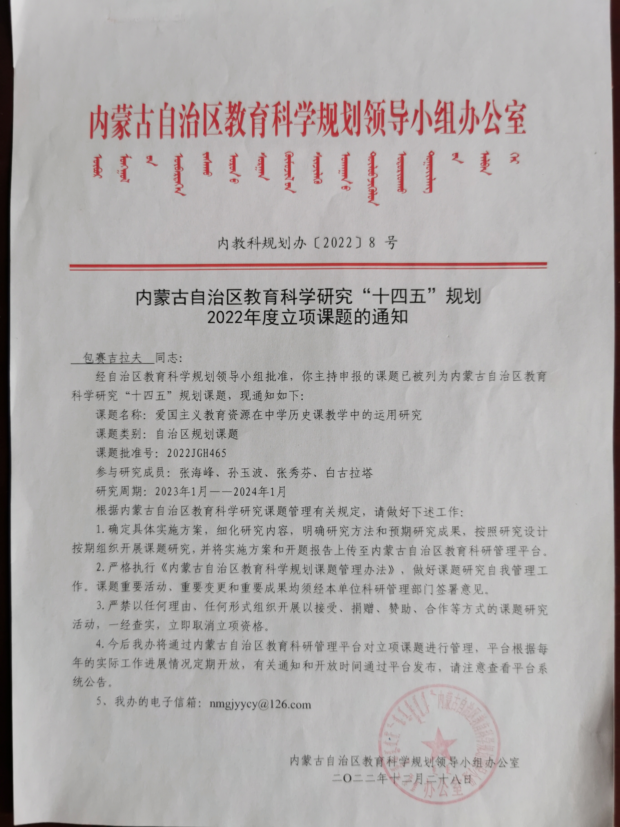 近期教育厅公示自治区教育科学“十四五”妄想项目2022年度项目评审效果,,,,,,我院包赛吉拉夫教授、赵梅兰博士、陈岚博士、呼斯勒图等4位西席申报的科研项目获准立项。。。。。。。。